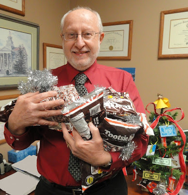 Dr. Del Lassen of Promise Community Health Center holds an armful of some of the bags of Tootsie Rolls he was given by Christmas by fellow staff members in response to his fun emails begging for gifts. |