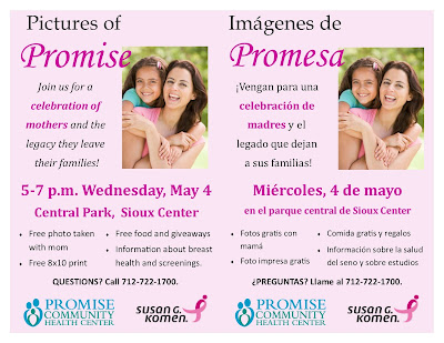 The health center is planning a Pictures of Promise event for 5-7 p.m. Wednesday, May 4, at Central Park in Sioux Center.