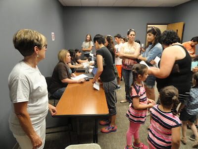 Families register their children for various screenings for school in Promise Community Health Center’s conference room during the annual Back-to-School Block Party on Wednesday, Aug. 12. |
