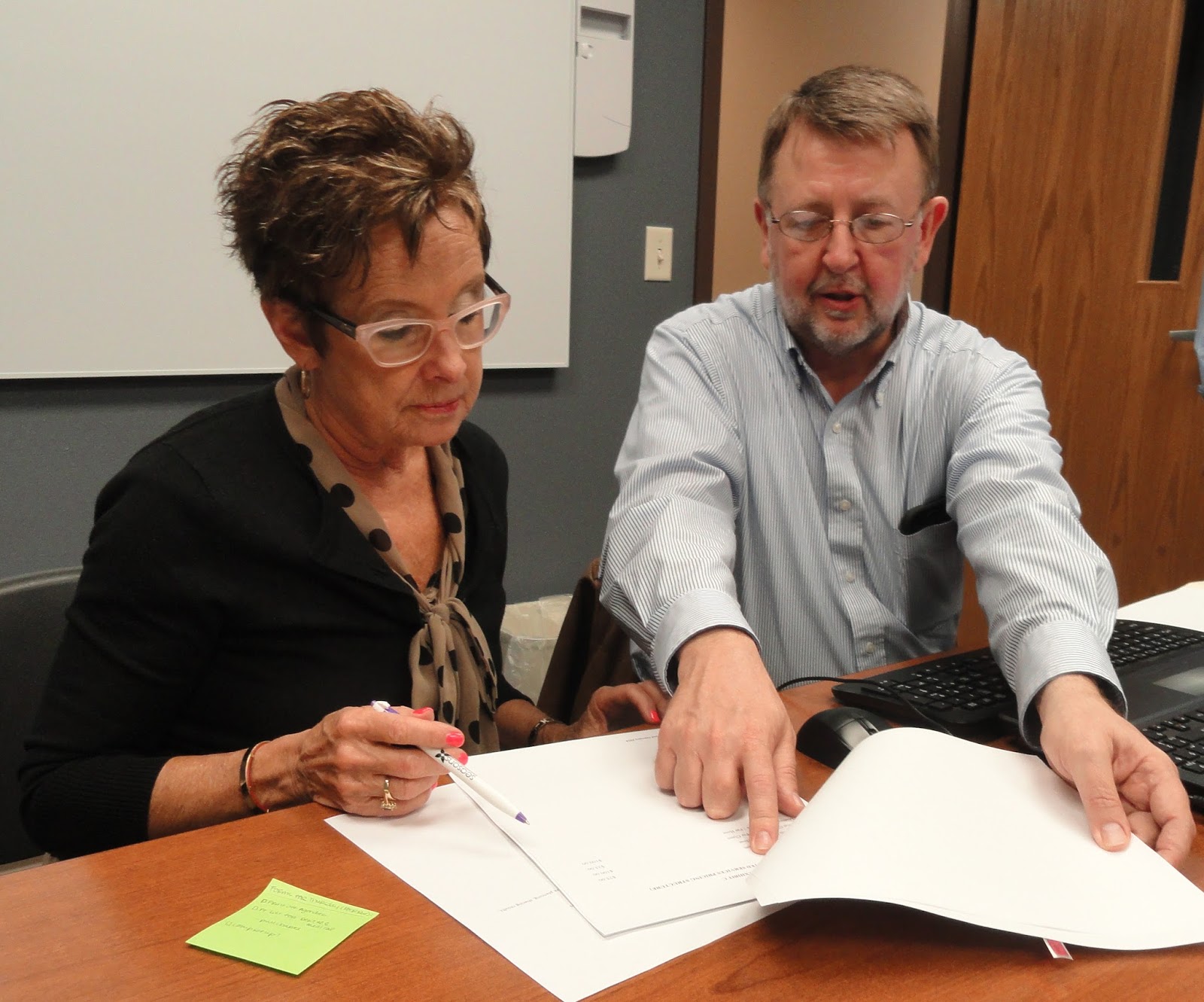 Promise executive director Nancy Dykstra and United CEO Rich Gehrig finalize an agreement for doing peer reviews between the agencies going forward. |
