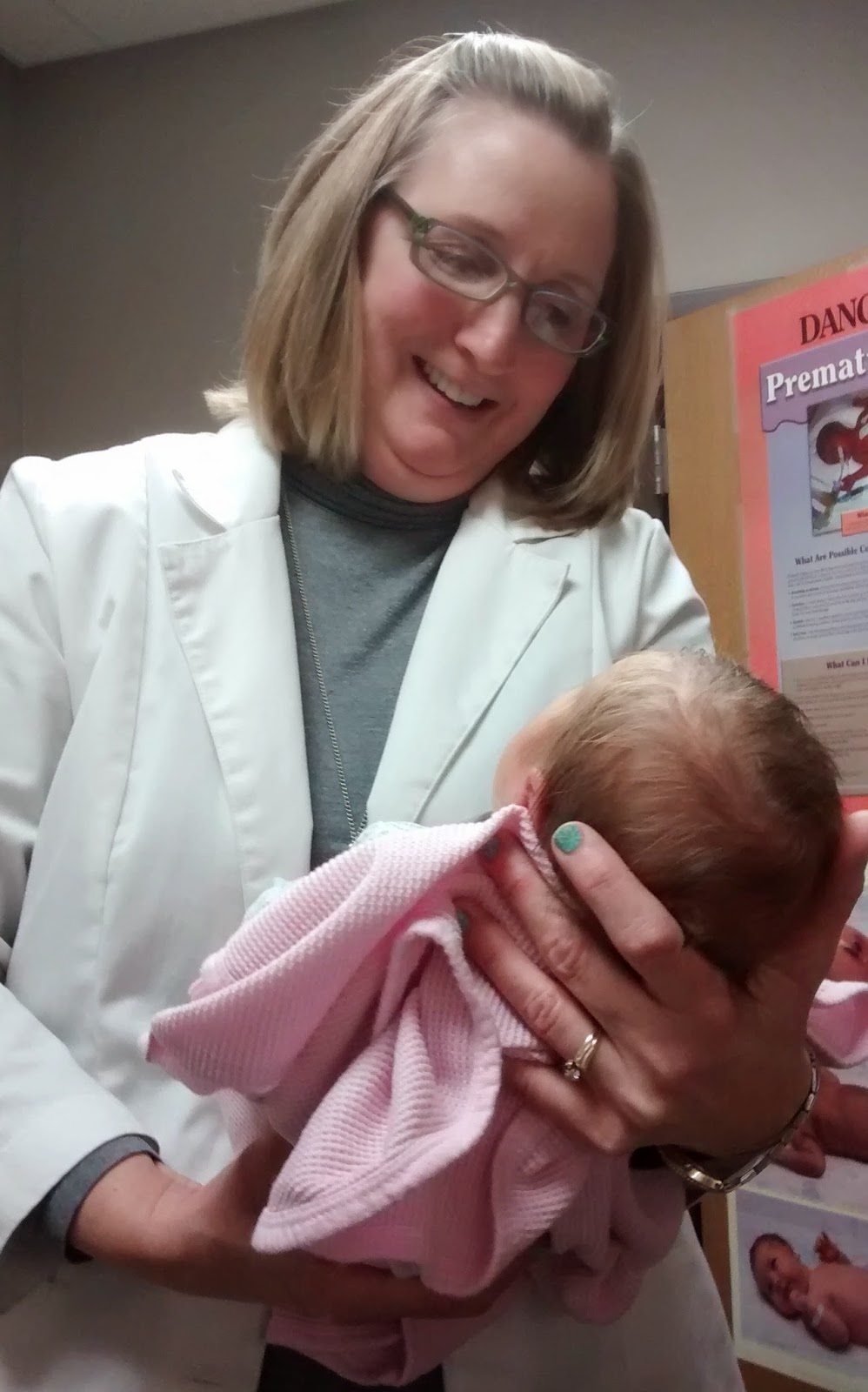 | Certified nurse midwife Pam Hulstein holds a baby who was recently born and came in for a regular checkup. |